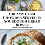 Making and serving Clam Chowder in Sourdough Bread Bowl Recipe is such a rewarding experience because it combines comfort food with a little bit of rustic charm that feels special without being complicated. Whether it’s an everyday dinner or a weekend indulgence, this recipe invites you to slow down, savor every spoonful, and share a delicious moment with those you love. Give it a try—you might just find your new favorite chilly day staple!
