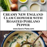 A rich and creamy New England-style clam chowder enhanced with roasted poblano peppers for a subtle smoky heat and bold flavor, creating a comforting and flavorful seafood soup.