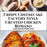 A crispy, cheesy chicken dish inspired by the Cheesecake Factory classic, featuring chicken breasts coated in a flavorful Romano-Parmesan breadcrumb crust and served with a tangy lemon butter sauce. This easy recipe balances crispy textures with a rich, zesty finish perfect for an elegant main course.