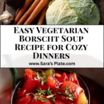 Easy Vegetarian Borscht is a vibrant and hearty beet soup filled with cabbage, potatoes, and carrots. This traditional Eastern European soup features a beautiful deep red color and a balanced blend of earthy, slightly sweet, and tangy flavors, perfect for a comforting meal.