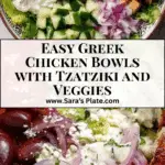 A refreshing and protein-packed Greek Chicken Bowl featuring juicy, oregano-seasoned grilled chicken, served over a bed of rice or quinoa with crisp cucumbers, cherry tomatoes, red onion, and tangy feta cheese, finished with creamy tzatziki sauce. Perfect for a healthy Mediterranean-inspired lunch or dinner.