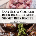 Rich, tender beef short ribs slow-cooked in beer or beef broth with aromatic onions, garlic, and herbs, resulting in melt-in-your-mouth perfection perfect for a hearty dinner.