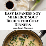 A comforting Japanese rice soup made with creamy soy milk and seasoned with soy sauce and sesame oil. This gentle-flavored zosui is perfect for a nourishing, warm meal, combining the heartiness of cooked rice with the subtle sweetness of soy milk and the richness of a softly cooked egg.